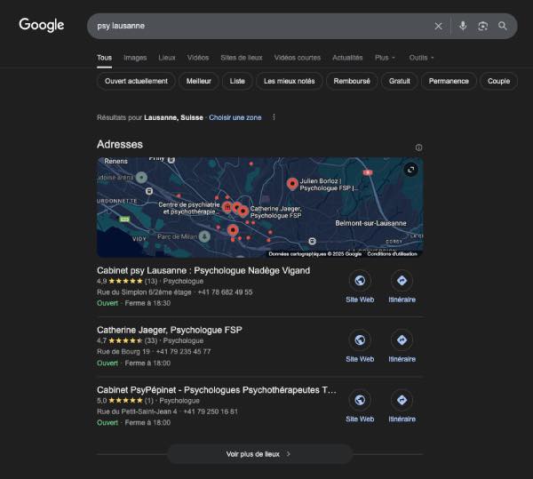 La fiche d’établissement Google (anciennement Google My Business) est un outil incontournable pour tout psychologue souhaitant renforcer sa visibilité locale. Elle apparaît dans les résultats Google lorsqu’un patient recherche “psychologue Genève”, “psychologue Lausanne”, “psychologue Nyon” ou toute autre ville de Suisse romande.